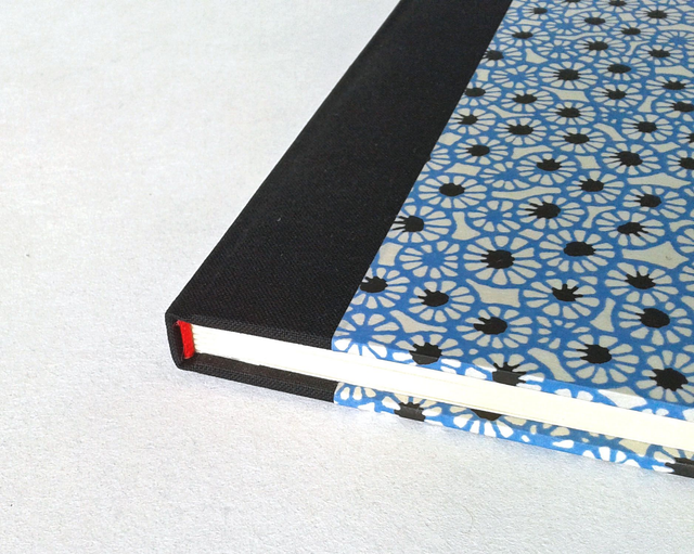 En format portrait, 48 pages, réglées, lettres couvertes avec du plastique pour protection. Dos en toile de reliure noire, plats en papier japonais Chiygami en bleu clair et noir.