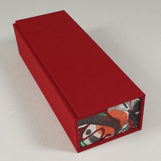 The box is made of 2 mm cardboard, covered with bookbinders cloth and Nepalese Lokta paper. The sides are covered with cut outs of some of Annettes original artworks which makes each box a unique object.