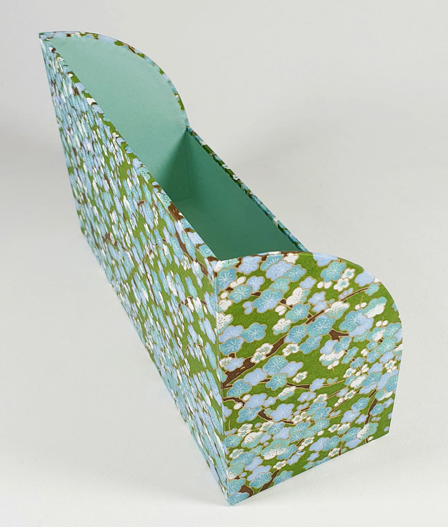 Ce porte-lettres aux côtés arrondis est en carton de 2 mm. L'extérieur ainsi que l'intérieur du dos sont recouverts de papier japonais Chiyogami. Les surfaces restantes et le bord supérieur sont recouverts de papier Japonais Satogami.